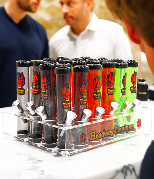 Headway Design Mini Carb Display Kit 24pk are high-quality acrylic eye-catching designed hand pipes. Awesome for spontaneous sessions these pieces are a must-have for any smoker. They are renowned for their large water pipes, featuring 3 foot, 4 foot, and even larger sized water pipes. In addition to delivering premium hits, it is easy to use, with simple cleaning and maintenance.