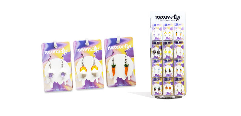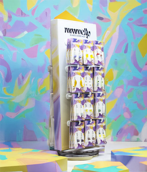 El juego de aretes Mmmelty viene con un exhibidor listo para el punto de venta, lo que le brinda un estante giratorio que muestra fácilmente la excelente cristalería.